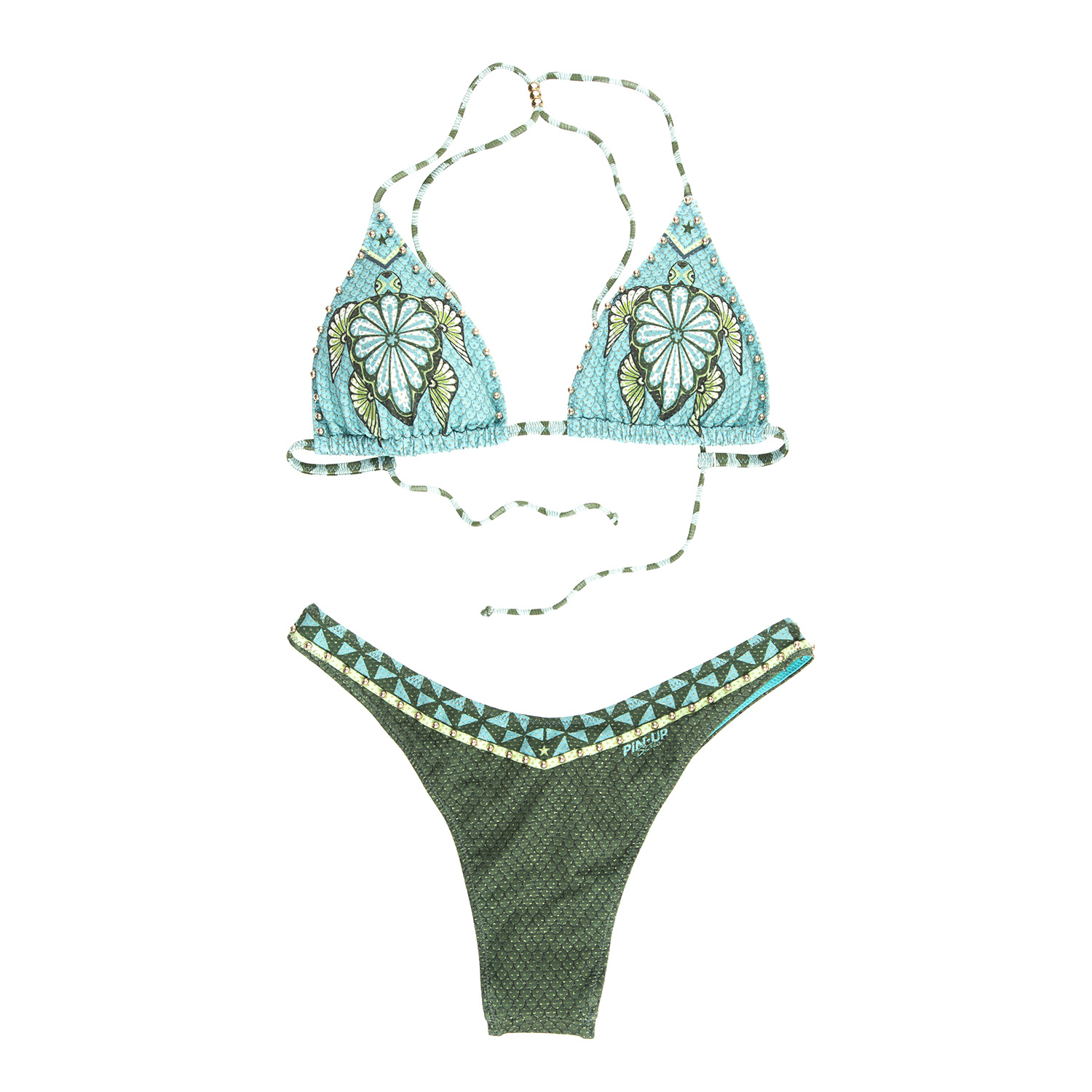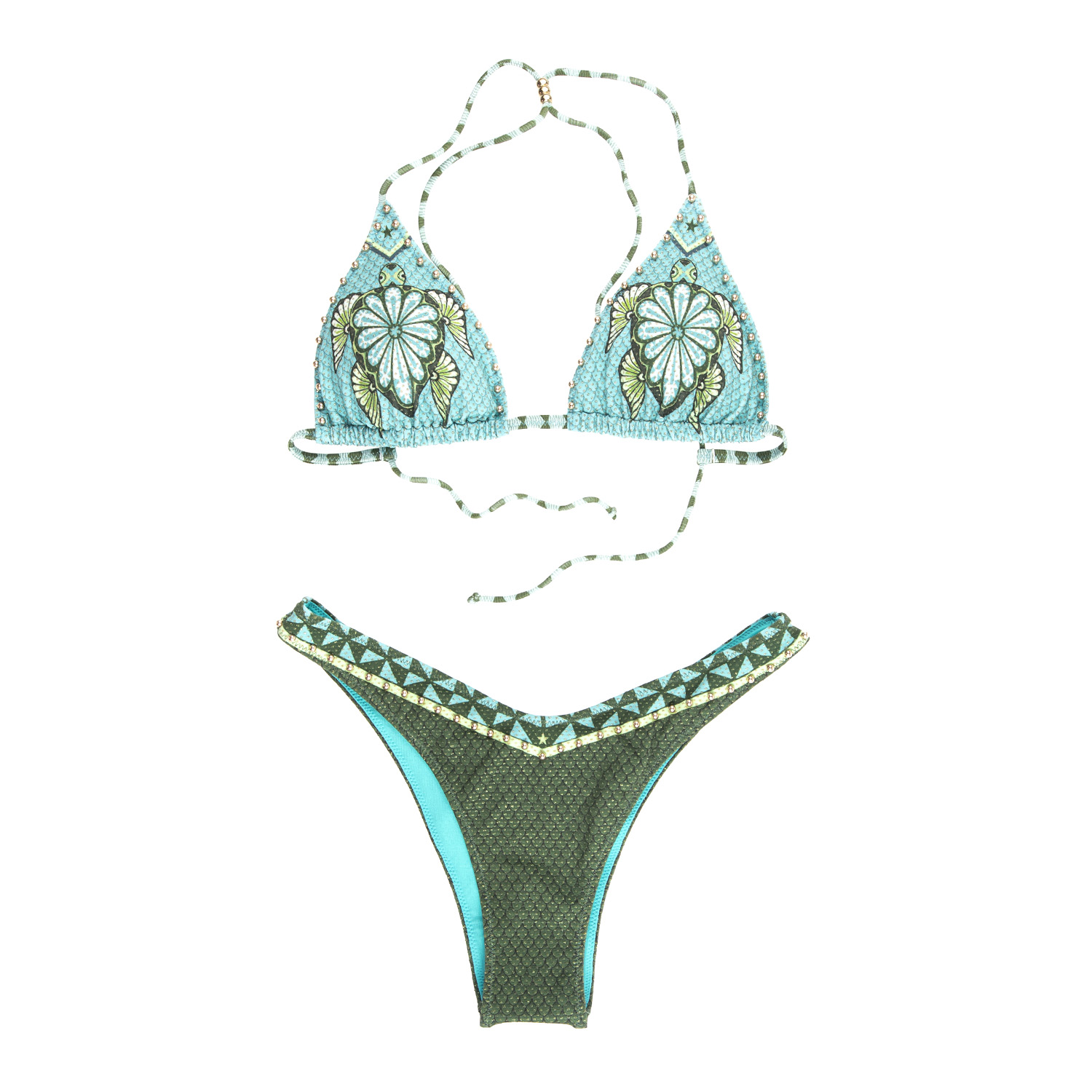 Descrizione: Un bikini triangolo scorrevole dal fascino ricercato, realizzato in lycra con lamina metallizzata e coppe con imbottitura estraibile. Un tocco distintivo: la tartaruga in rilievo impreziosita da microborchie, per un dettaglio sofisticato e glam.